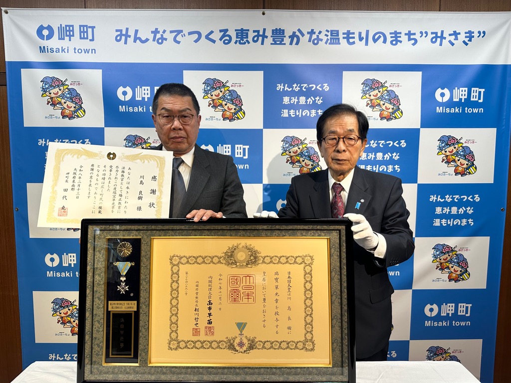 川島さんは法務教官として長きにわたり、少年少女の矯正教育の職務に尽力されました。この度その功績が評価され、瑞宝単光章を受章されました。町長は、川島さんの功績に敬意を表するとともに、心からお祝いを申し上げ感謝状を贈呈しました。