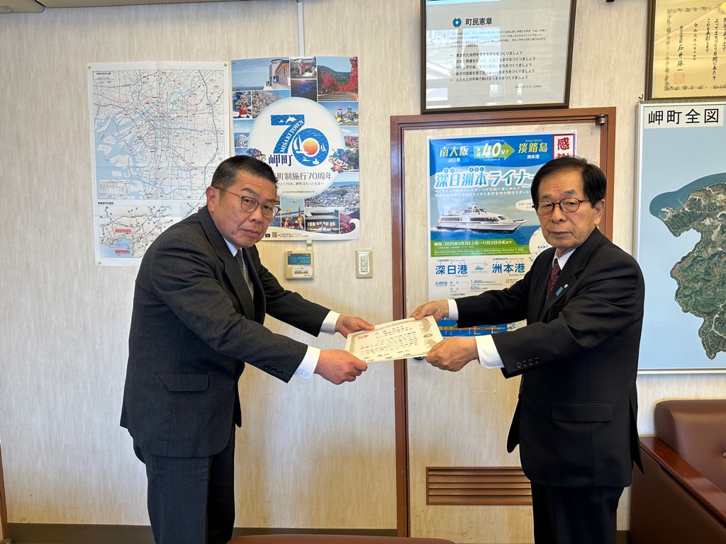 岬町にて労働派遣業を行っている株式会社HIT 取締役会長 高倉 弘様、代表取締役 入口 剛様より、本町の町づくりに対して岬ゆめ・みらい寄附金として多額の寄付を賜りました。町長は、そのご厚意に対し感謝状を贈呈いたしました。
