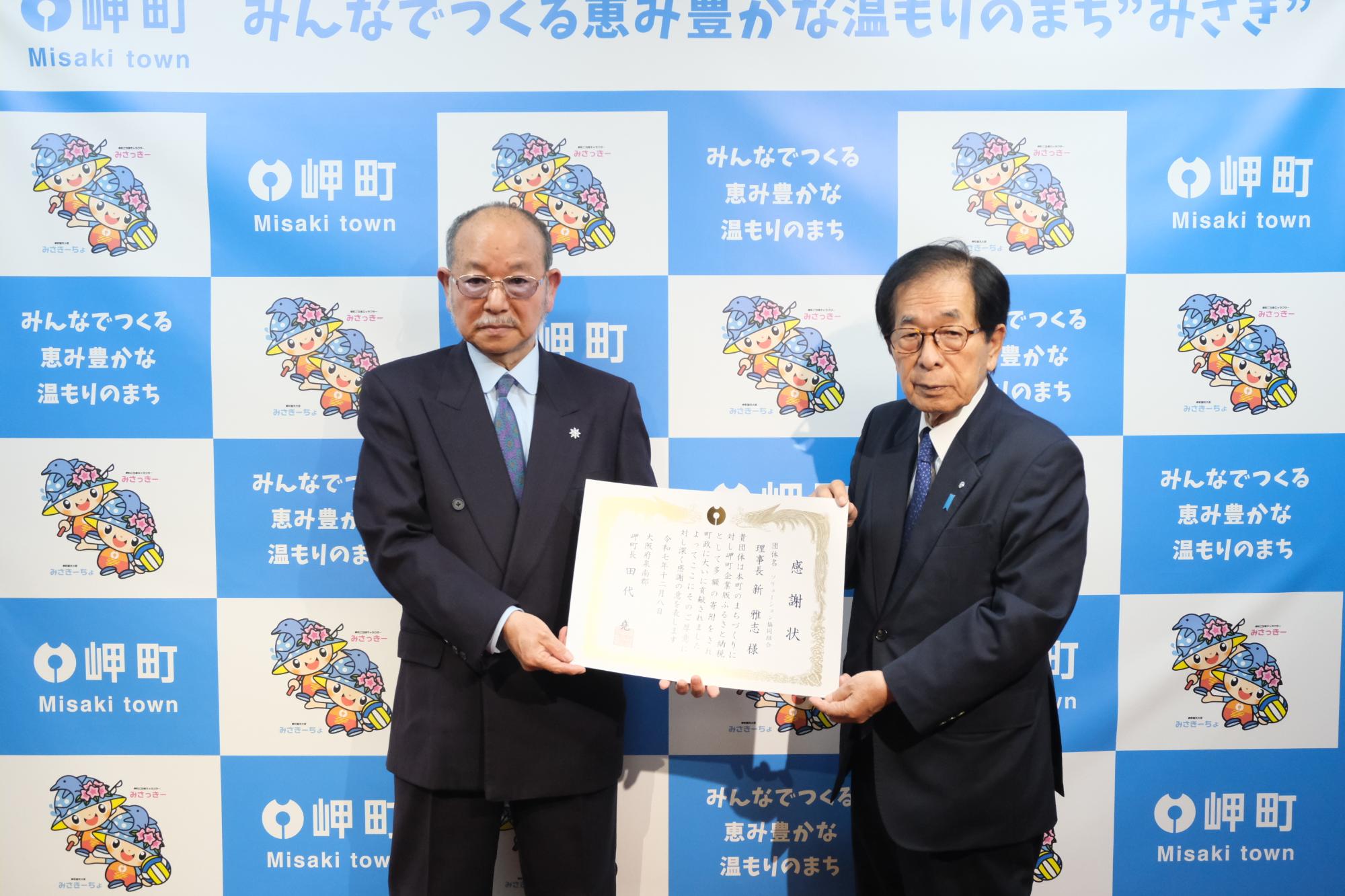 ソリューション協同組合 代表理事 新様より、本町の町づくりに対して企業版ふるさと納税として多額のご寄附を賜り、そのご厚意に対し感謝状を贈呈しました。