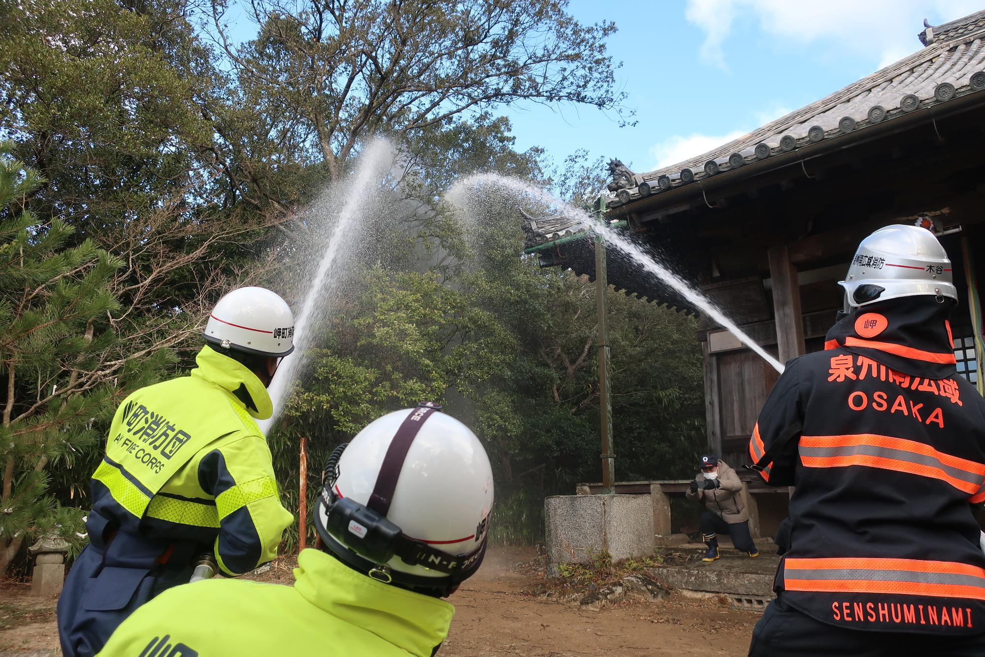 本大会では、第69回大阪府消防操法訓練大会に出場する岸和田市消防団(可搬ポンプ操法の部)と田尻町消防団(ポンプ車操法の部)による模範訓練が行われました。